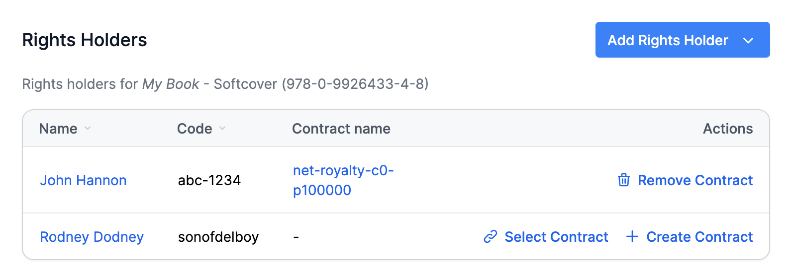 You can link a rights holder to this title format by using the ‘Add Rights Holder button. Then, you must add a contract to determine the rights hodler’s ownership rules for this title format. You can select an existing contract type (e.g. if you wish to use a standard contract), or you can create a brand new contract. Learn more about contracts in Royalties HQ.